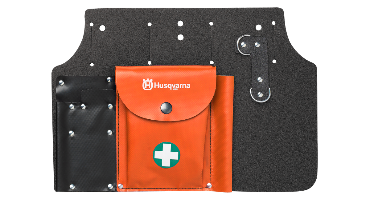 Med stor förvaringsficka som rymmer första förband, reservkedja och förgasarskruvmejsel. Hållare för fil, filmall och kombinyckel.