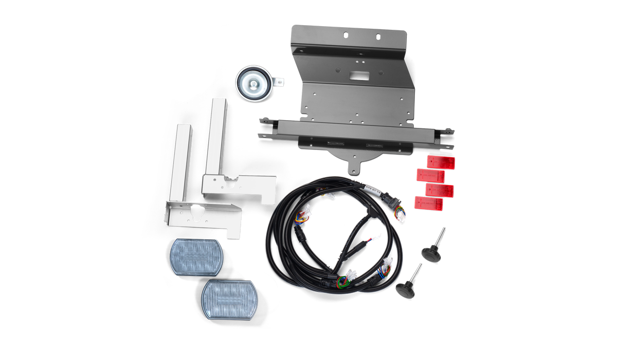 Positionsljus och blinkers för montering på ROPS-bågen bestående av LED-lampor för optimal energiåtgång. Vid manövrering i smala passager eller andra tillfällen då ROPS-bågen behöver fällas kan lamporna enkelt justeras till annan position. Kräver kontrollbox.