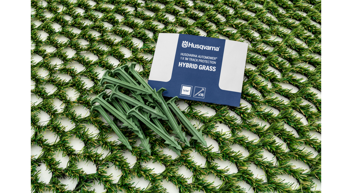 Husqvarna Automower® hybridgräs ger bättre grepp för din robotgräsklippare och förhindrar att den slirar och stannar i trånga utrymmen och branta sluttningar. På detta sätt skyddas slitna, kala och ömtåliga gräsytor. Möjliggör fortsatt klippning även där det finns kala ytor i gräsmattan. Husqvarna Automower® hybridgräs är slittåligt och enkelt att installera och ta bort. Storleken finns i 1×1 m och 2x10m. och levereras med 16/ 170 gröna märlor. Detta hybridgräs är en del av vårt breda utbud av högkvalitativa Automower®-tillbehör.