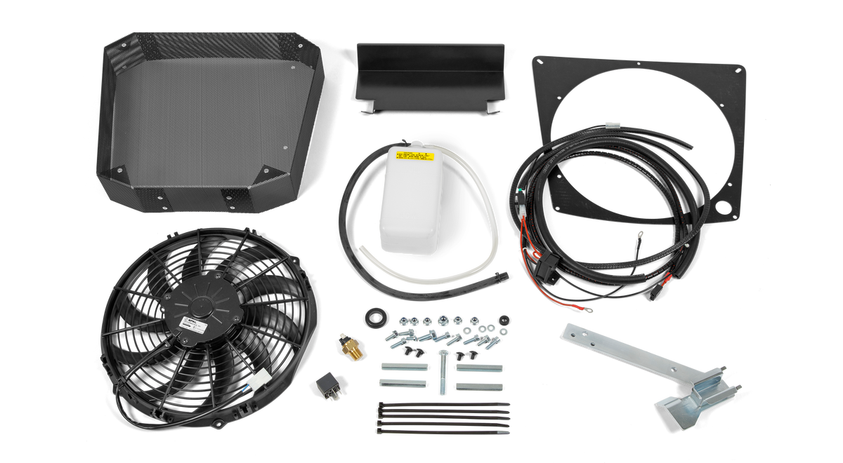 Kylsats som monteras på motorhuven när maskinen används i varmt klimat. Satsen består av en elektrisk fläkt, en expansionstank, slangar samt nödvändiga monteringsdetaljer.