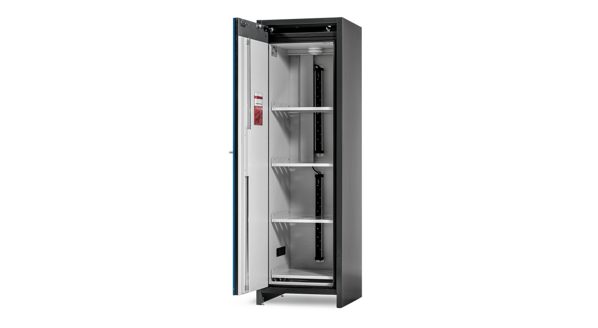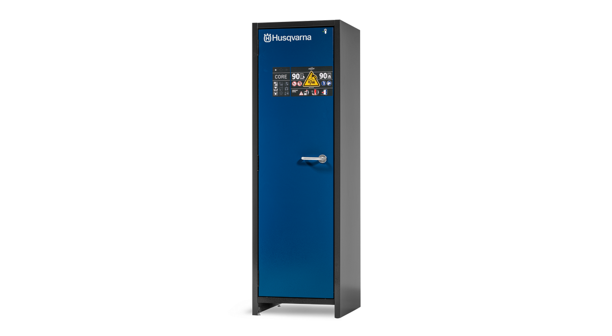 Husqvarnas batteriladdningsskåp M är konstruerat för säker och godkänd förvaring och laddning av litiumjonbatterier. Detta endörrars 400V-skåp erbjuder 90 minuters brandmotstånd från utsidan in och inifrån och ut*. Utrustad med en rökdetektor som ger tidig upptäckt av begynnande bränder och ett larmsystem som säkerställer att larm på plats skickas omgående. Grenuttag och hyllor ingår. – *Enligt EN-14470-1 och EN-13631