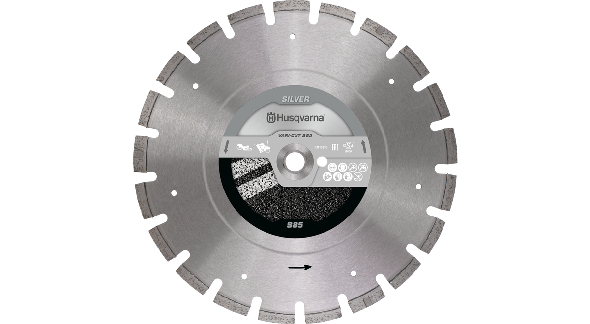 Vari-Cut S85 är en del i silver-serien för klingor och är speciellt utformad med bredare slitsar för bättre kapning av asfalt, färsk betong och andra mycket abrasiva användningsområden. Klingan har ett skyddssegment som förhindrar underskärning.