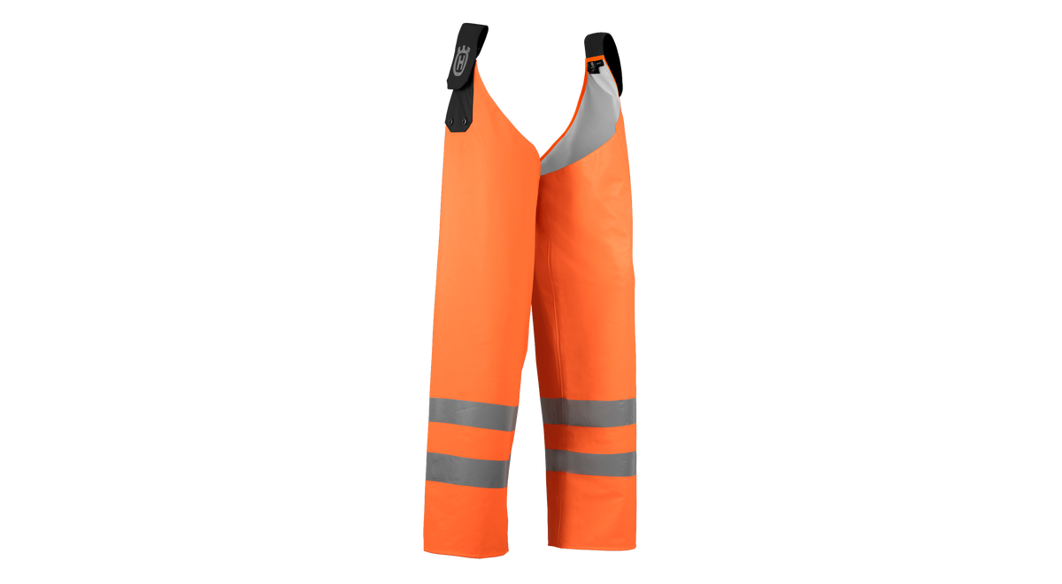 Regnbyxholkar tillverkade av polyestertrikå med en hållbar ensidig PU-beläggning med svetsade sömmar – ett starkt men ändå lätt och ljudlöst material. Designade för att fästas på ett bälte eller verktygsbälte. Godkända enligt EN ISO 20471 klass 1 och EN 343. En storlek.