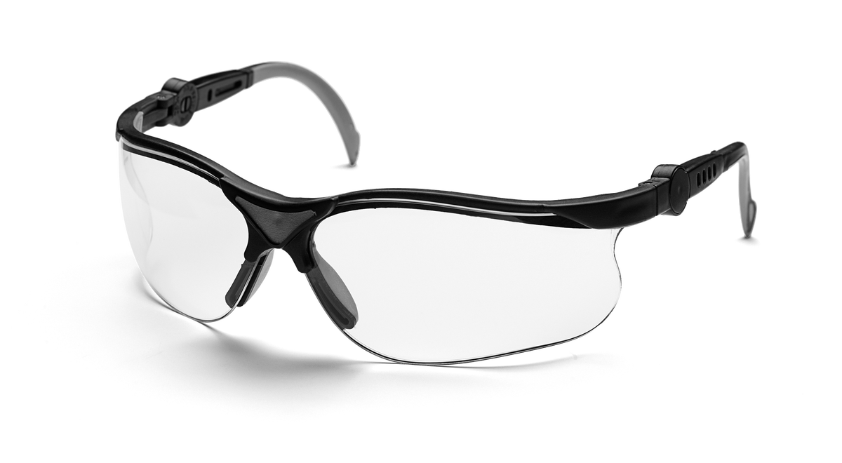 Skyddsglasögon med repfria, klara linser. Med bågar som kan förlängas och linser som kan vinklas. Godkända enligt EN 166, ANSI Z87+.
