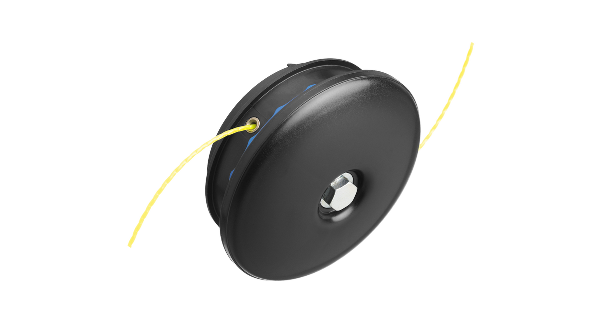 Trimmerhuvud med manuell trådmatning. Användaren matar ut tråden manuellt genom att trycka på trådmatningsknappen och dra i tråden.